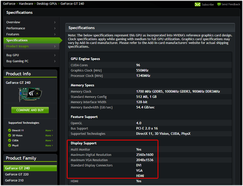 그래픽 카드의 최대 해상도는 제조사의 출고스펙으로 확인이 가능하다.
