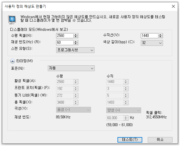 수평 픽셀은 2560, 수직선은 1440, 재생 빈도는 60, 스캔 유형은 프로그래시브로 맞춰주고 "테스트"를 시행한다.